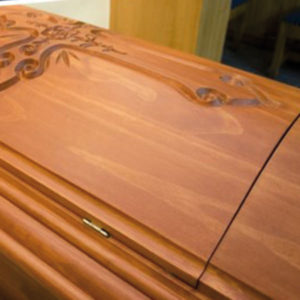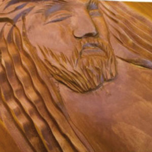 Tapa tallada con distintos motivos religiosos.