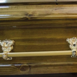 • Urna de madera de pino terciado con manillas laterales metálicas con ornamentación plástica, de fabricación nacional.